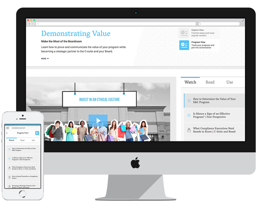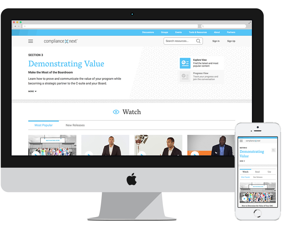 NAVEX Global creates a suite of ethics & compliance tools, content and services used by organizations to address compliance risks and threats. In 2017 they wanted to launch an online community and resource center for compliance experts. Working with agency Roboboogie, I was tasked with designing desktop and mobile views for their Compliance Next website.